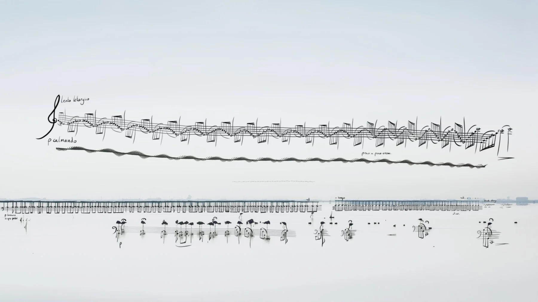 Dido’s Lament by Henry Purcell is overlayed onto the contours of a hill near the Glyndebourne opera house. The geographical undulations twist and refract the staves, and similarly distort the lament.